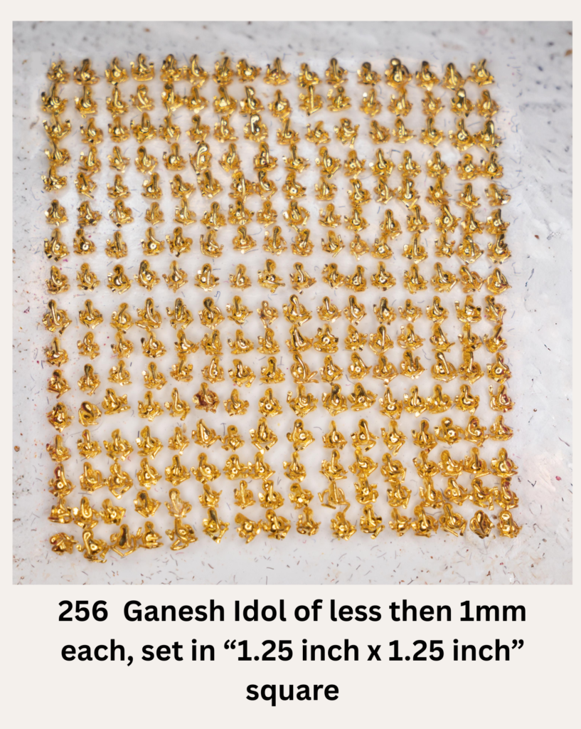 Fast forward to today, and his legacy has only grown stronger. In a recent accomplishment, Bhagwandas meticulously crafted a breathtaking collection of 256 unique gold micro Ganesh idols. Each idol is just 1 mm in size and together they have been beautifully placed within a compact frame of “1.25 inch x 1.25 inch square.